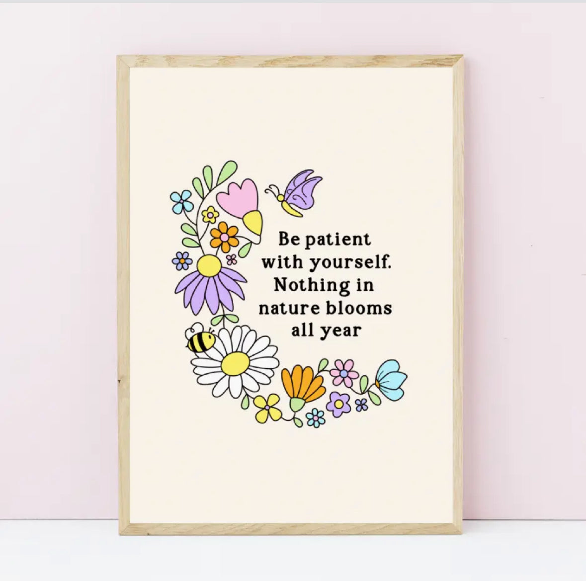 The central message, "Be patient with yourself. Nothing in nature blooms all year," is encircled by a delicate dance of floral illustrations.